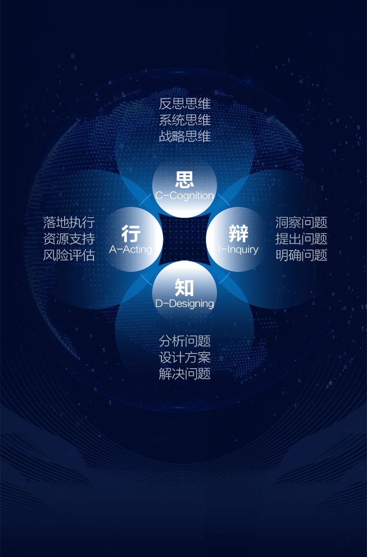在整体课程体系中,嵌入CIDA行动学习方法论。 基于学员实际决策场景或对标案例,展开问题萃取-问题分析-问题解决-问题验收的学习过程。 学习方法论涵盖听课、提问、反思、讨论、教练、设计方案等。 从认知(思)、质询(辩)、方案设计(知)和行动落地(行)几个层面,帮助学员做到认知升维和行动降维。
