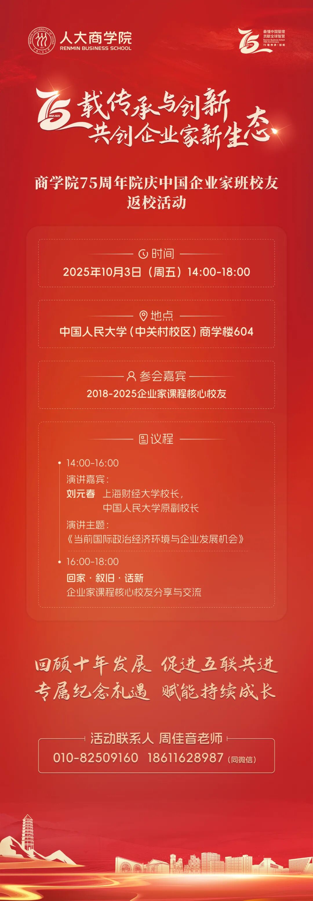 中国人民大学商学院中国企业家课程,快速增长优秀企业之间、企业与专业人才、企业与标杆企业之间、与高端智库和校友联盟之间的相互连接与资源共享。