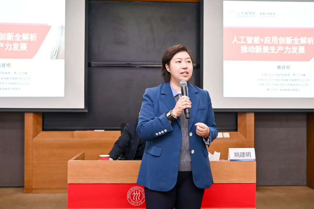 本次课程特邀中国人民大学商学院教授、博士生导师姚建明担任主讲嘉宾。姚教授同时担任中国人民大学中国企业创新发展研究中心主任、中国人民大学国企改革与发展研究中心主任以及数字经济产业创新研究院院长,在数字经济与企业创新领域拥有深厚的学术造诣和丰富的实践经验。他以《人工智能+应用实例全解析》为主题,为到场嘉宾带来了一场内容丰富、见解独到的精彩分享。