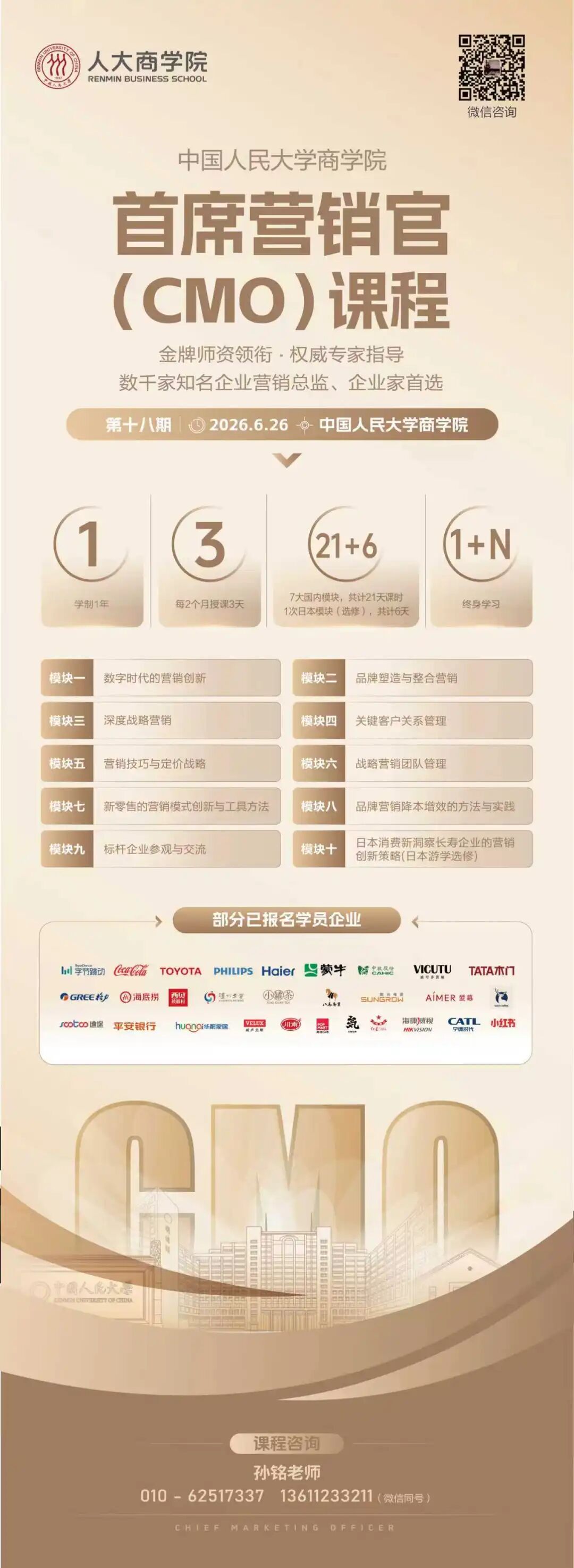 中国人民大学商学院首席营销官(CMO)课程,洞察时代趋势、紧贴前沿营销理论与工具方法,分享鲜活实战案例、引领新时代营销发展,培养具有前瞻全球视野、优秀执行能力和扎实专业技能的新一代复合型营销专才。