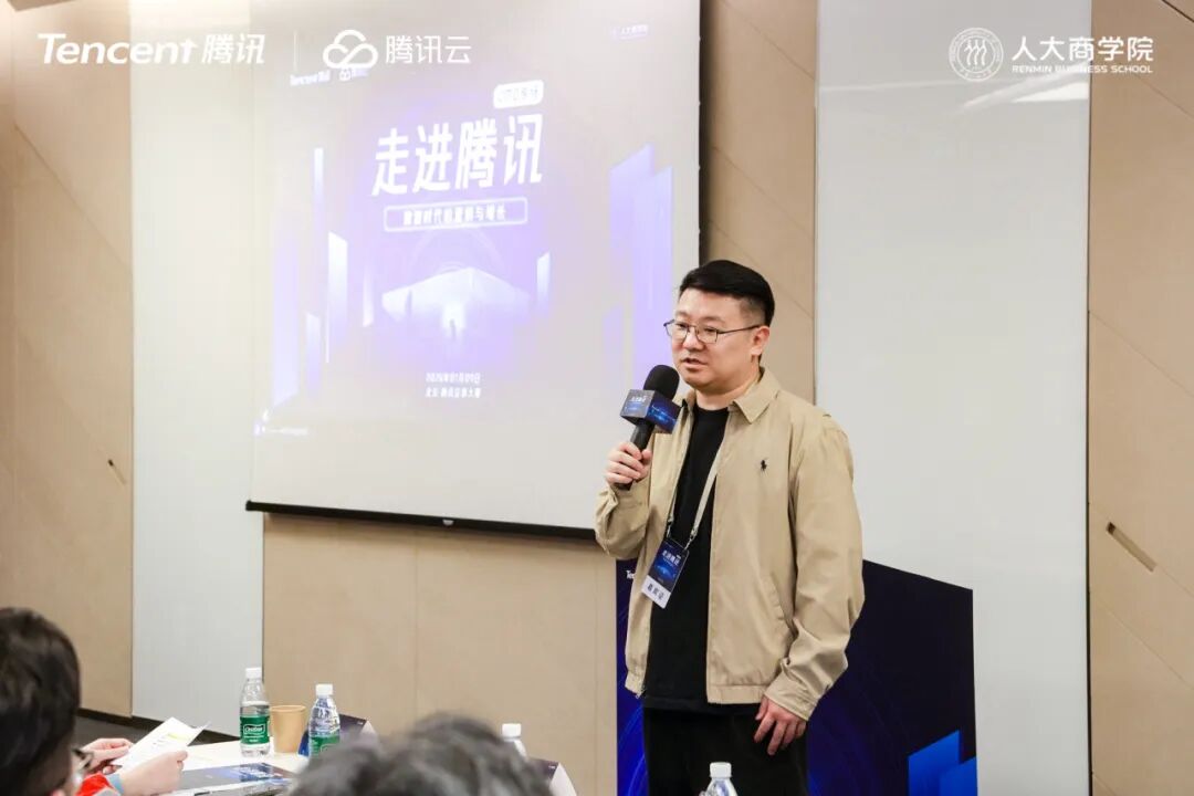 人大商学院EE中心公开课程部部长、首席营销官(CMO)课程负责人孙铭老师首先致开场词。他对腾讯的热情接待表示衷心感谢,并表示「企业参访」是首席营销官(CMO)课程中极具价值的传统环节。通过互访活动,校友们可以近距离观察和学习彼此的商业模式、管理经验和创新实践,从而实现知识共享与智慧碰撞。他鼓励在场的每一位学员积极参与讨论,勇于分享自己的见解和经验,以实现个人和企业的共同成长。